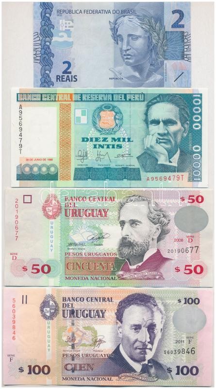 Peru 1988. 10.000I + Brazília 2010. 2R + Uruguay 2008. 50P + 2011. 100P T:I-