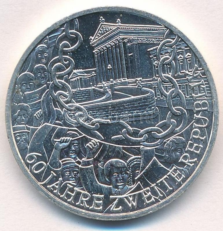 Ausztria 2005. 10E Ag "A Második Köztársaság 60. évfordulója"... https://www.darabanth.com/en/359-Online-auction/359.0/Numismatics/Worldwide-silver-and-metal-coins~2000014/Ausztria-2005-10E-Ag-A-Masodik-Koztarsasag-60-evforduloja-T1-Austria-2005-10-Euro-Ag-6~II2050054