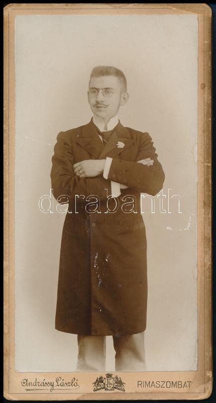 Description: 1901 Fiatal úr portréja, a hátoldalon ajándékozási sorokkal kedvesének eljegyzésük alkalmából, keményhátú fotó, Rimaszombat, Andrássy László műterméből, a felületén kopásnyommal, a kartonon lapattanással, 15x8 cm