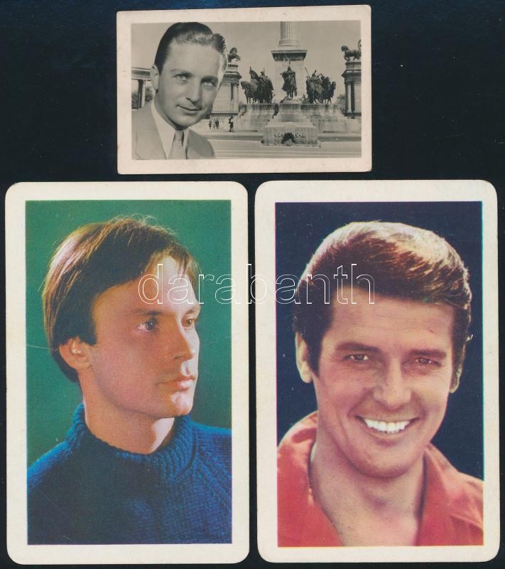 7 db színészeket ábrázoló fotó és nyomtatvány, (Domján Edit, Latinovits Zoltán, stb.), az egyik dedikálva, 4,5×7 és 15×9,5 cm közötti méretekben