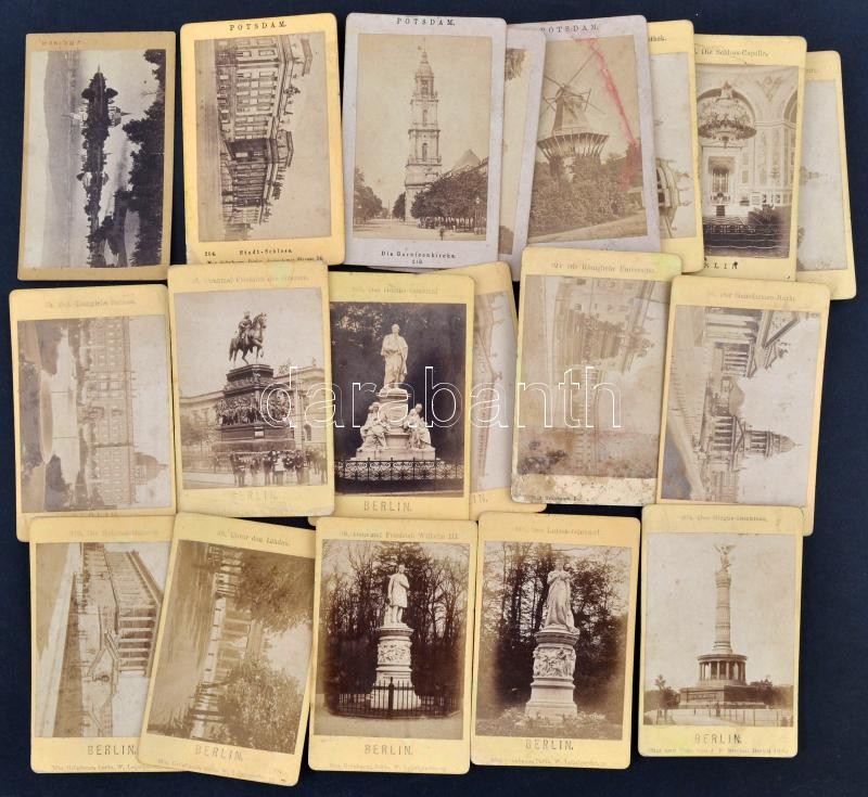 Description: cca 1900 18 db fotó Berlinről és Potsdamról, Berlin, nagyrészt Max Grünbaum (14 db), és J. F. Stiehm (4 db) műtermeiből, valamint Klagenfurt, J. Reiner azonosítatlan fotója, összesen 19 db keményhátú fotó,10x6 cm.