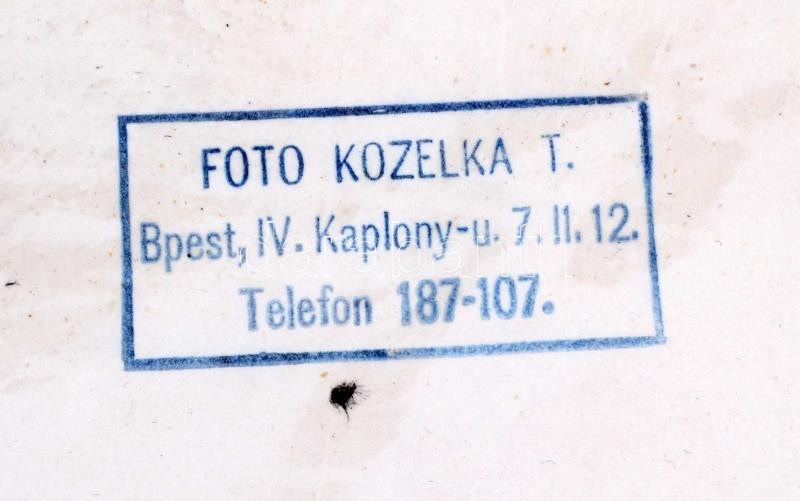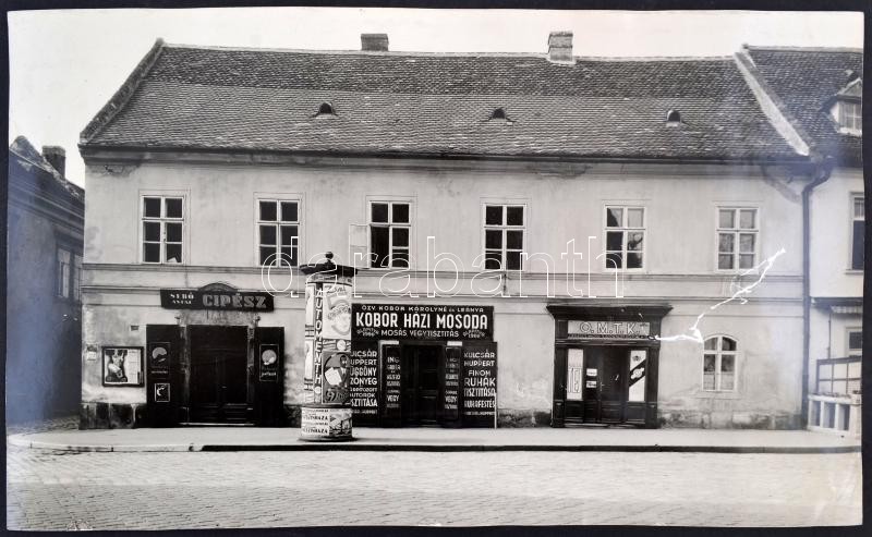 cca 1930-1940 Kozelka Tivadar (1885-1980): Budai vár, Tárnok utca 18., Unger-ház, Sebó Antal cipész, Özv. Kóbor Károlyné és Leánya Kóbor Házi mosodája, Országos Magyar Tejszövetkezeti Központ üzleteivel, ma: Arany Sas Patika Múzeum, fotó, pecséttel jelzett, a felületén sérüléssel, 48x28 cm