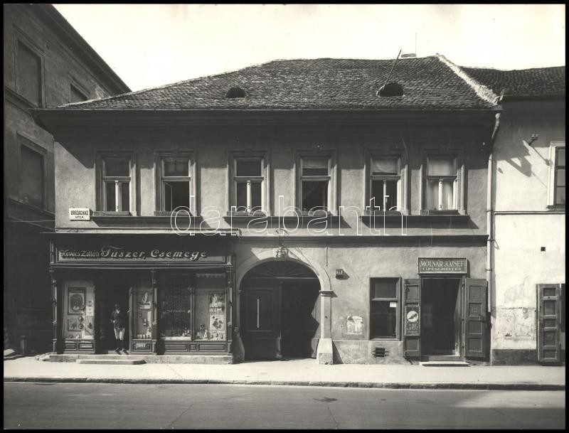 Description: cca 1941-1942 Budai vár, Országház utca 18., Kronowetter-Fischle-ház, rajta: Kovács Zoltán Fűszer-Csemge, és Molnár József cipészmester üzleteivel, fotó, jelzés nélkül, 29x38 cm