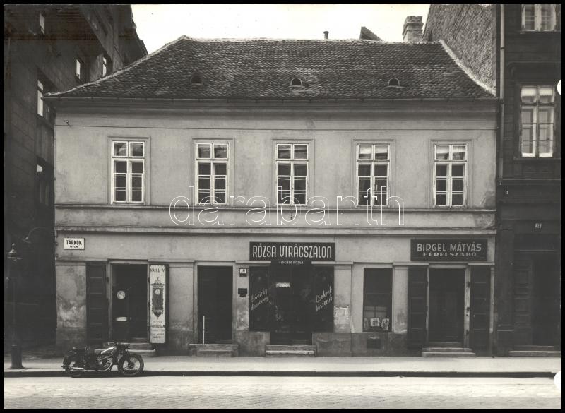 cca 1941-1942 Kozelka Tivadar (1885-1980): Budai vár, Tárnok utca 10., Matyéka-ház, a képen Kaill V. órás, Fischer Rózsa Rózsa Virágszalonja, Birgel Mátyás férfi szabó üzleteivel, fotó, a hátoldalon pecséttel jelzett, törésnyommal az egyik sarkán, 28x39 cm