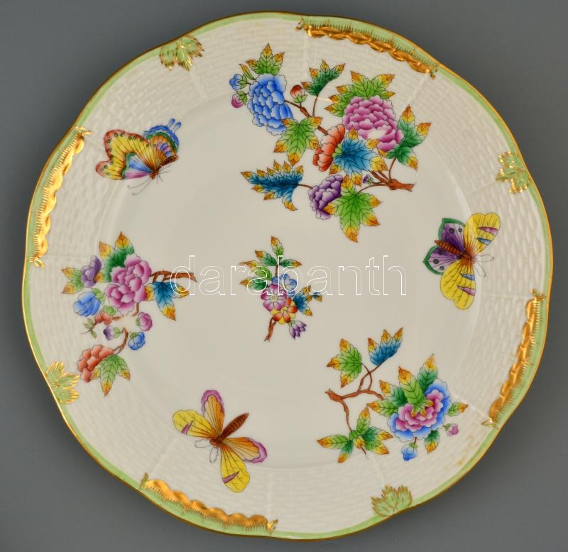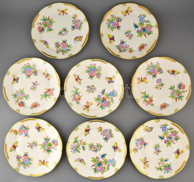 Herendi Viktória mintás lapostányér (8 db), kézzel festett, jelzett, kopásnyomokkal, d:25,5 cm