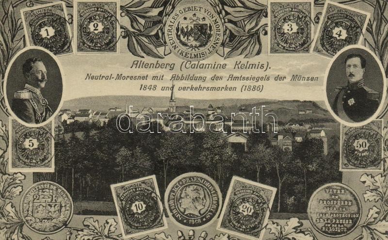Description: Altenberg, Neutral Moresnet (Kelmis, La Calamine); Neutral-Moresnet mit Abbildung des Amtssiegels der Münzen 1848 und verkehrsmarken 1886 / general view, stamps, coins, coat of arms, Art Nouveau