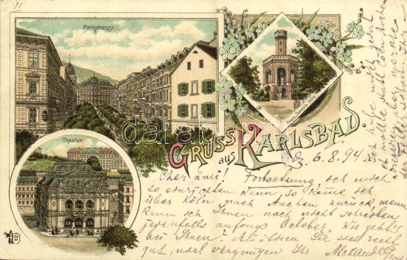 1894 Karlovy Vary, Karlsbad; Parkstrasse, Theater, Franz Joseph's Höhe / promenade, theatre, observation tower, Art Nouveau, floral, litho