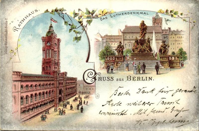 1898 Berlin, Rathaus, Das Lutherdenkmal. Verlag G. Hendelsohn / town hall, Luther monument. Art Nouveau, floral, litho
