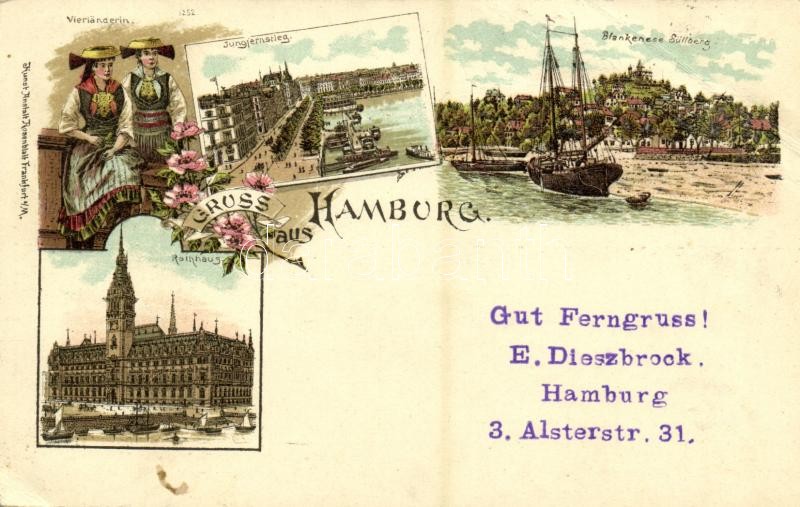 1898 Hamburg, Jungfernstieg, Blankenese Süllberg, Rathaus, Vierländerin. Kunst. Anstalt Rosenblatt 1252. Art Nouveau, floral, litho (EB)