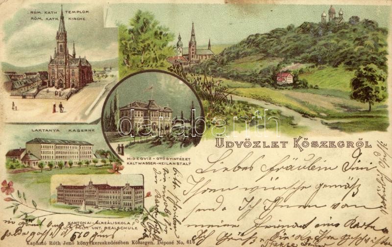 1898 Kőszeg, Hideg vízgyógyintézet, Római katolikus templom, laktanya, Katonai alreáliskola, Róth Jenő floral litho (Rb)