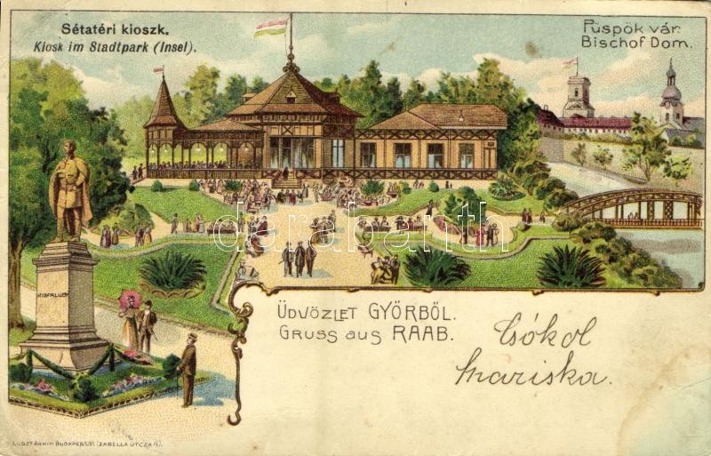 1902 Győr, Püspöki vár, Sétatéri kioszk, Kisfaludy szobor, híd. Luszt Ármin kiadása. Art Nouveau, litho (EB)