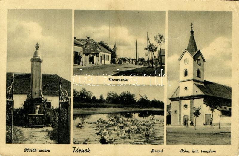 Tárnok, Hősök szobra, emlékmű, utca, Strand, fürdőzők, Római katolikus...