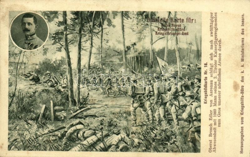 Description: Kriegsbildkarte Nr. 18. Oberst Brosch Edler von Aarenau schlägt sich nach zwölftägiger Abwesenheit mit 1000 Mann seines 2. Tiroler Kaiserjägerregimentes zum Gros unserer nördlichen Armee durch. Kriegshilfsbüro / WWI Austro-Hungarian K.u.K. military art postcard. Colonel Brosch Edler von Aarenau s: Wintorowski (fl)