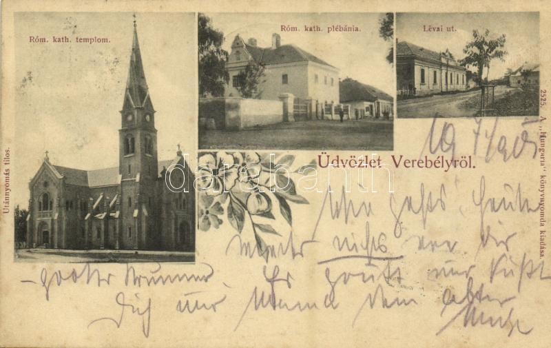 1905 Verebély, Vráble; Római katolikus templom és plébánia, Lévai út. Hungária könyvnyomda kiadása / church and rectory, street. floral