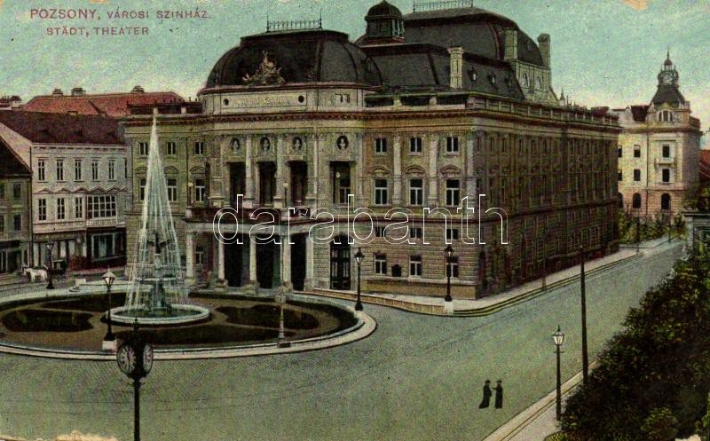 1909 Pozsony, Pressburg, Bratislava; Városi színház, szökőkút / Städt....