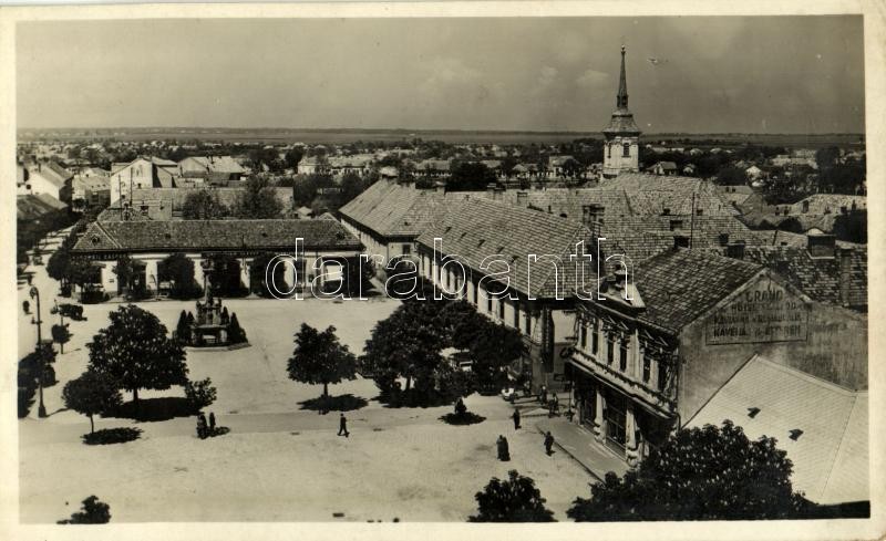 Description: Érsekújvár, Nové Zámky; Fő tér, Grand Hotel Szálloda, étterem és kávéház, Kurzweil Gáspár és Lövy Herman üzlete / main square, hotel, restaurant and cafe, shops