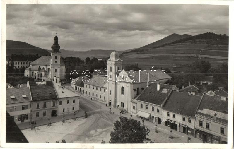 Rozsnyó, Roznava; Fő tér, Székesegyház és a Premontrei gimnázium, Sajó-Vidék, Schnitzer üzlete, Tátra Bank, majális útvonala / main square, cathedral, grammar school, shops, bank (EK)