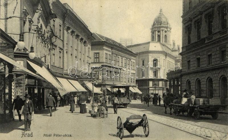 1912 Arad, Atzél Péter utca, lovas szekerek, lóvasút, Szálloda a Fehér Kereszthez, üzletek / street, hotel, horse carts, horse-drawn tram, shops