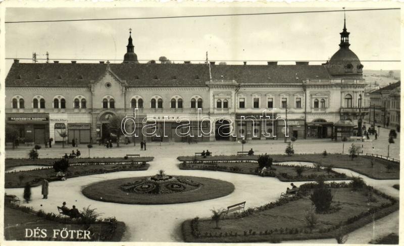 1942 Dés, Dej; Fő tér, Hangya, Szigyártó Sámuel, Moritz Ernő, Szentkirályi Jenő, Salamon Jakab cipőáruház, Gersner Ödön, Bíró, Wolf, Heinovits Ferenc üzlete, gyógyszertár / main square, shops, pharmacy