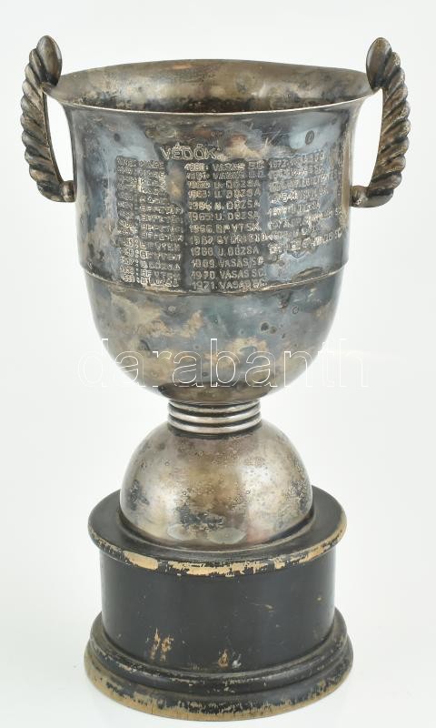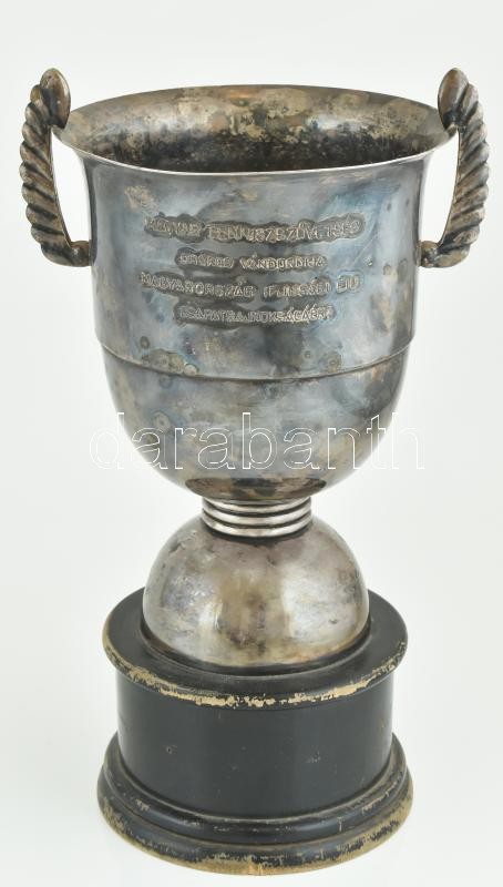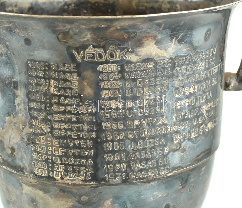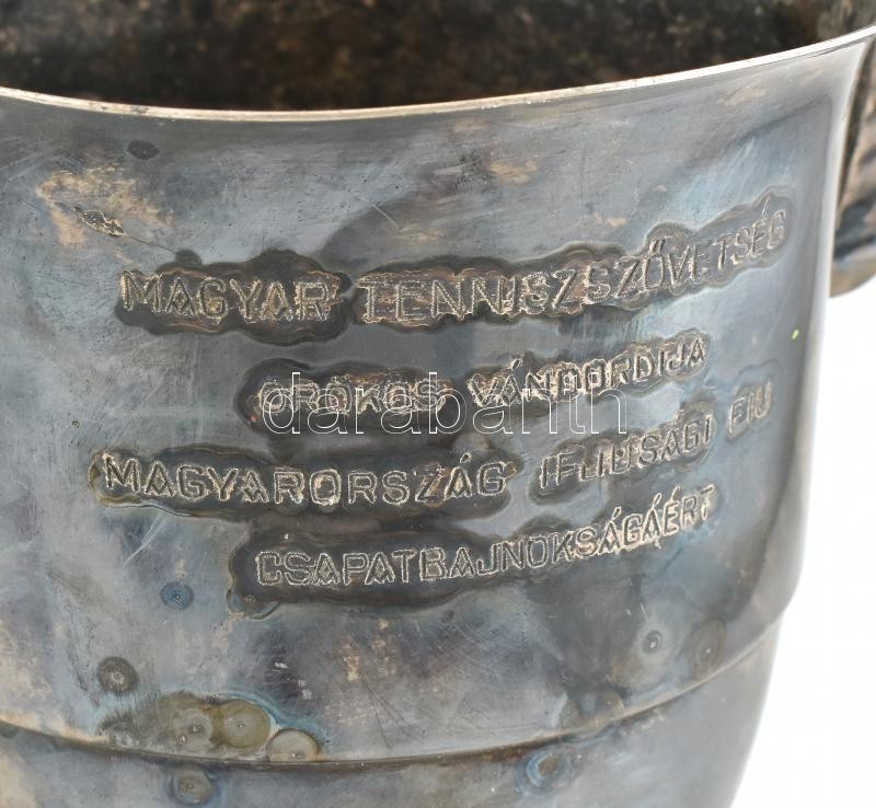 Description: Magyar Tenisszövetség örökös vándordíja Magyarország ifjúsági fiú csapatbajnokának. 1946-1979 évek bajnokainak felvésésével. Ezüstözött alpakka, fa talapzaton.Kopott 33 cm