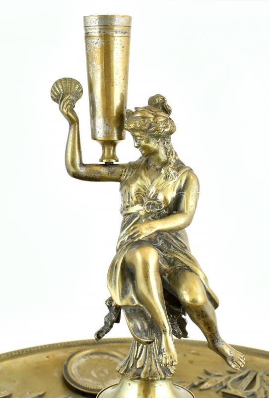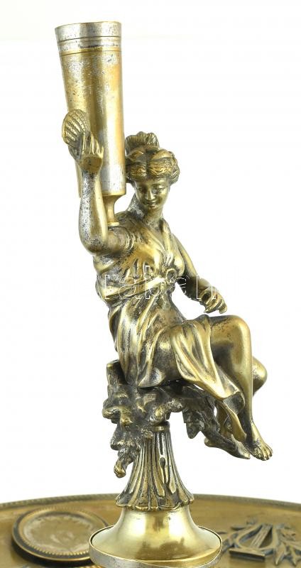 Description: Talpas kínálótál. Ezüstözött alpakka, erősen kopott, apró horpadás nyomokkal. Tetején figurális Vénusz, fogvájótartóval. cca. 1900. Feltehetően Bécs. Jelzés nélkül. m: 37cm, d: 33 cm