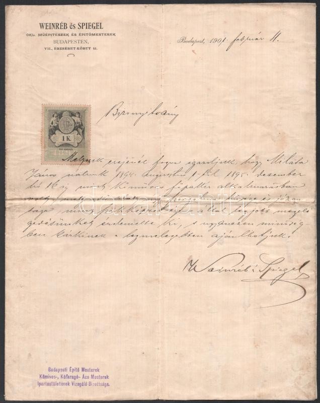 1901 Bp., Weinréb és Spiegel okl. műépítészek és építőmesterek fejléces levélpapírjára írt munkáltatói igazolás 1K okmánybélyeggel, Weinréb és Spiegel aláírással, szabadkőműves papíron