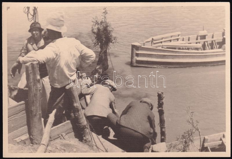 cca 1935 Merítés a Jordán folyóból, magyar zarándokcsoport jeruzsálemi útján készült fotó, hátoldalon feliratozva, 8,5×12,5 cm