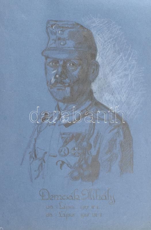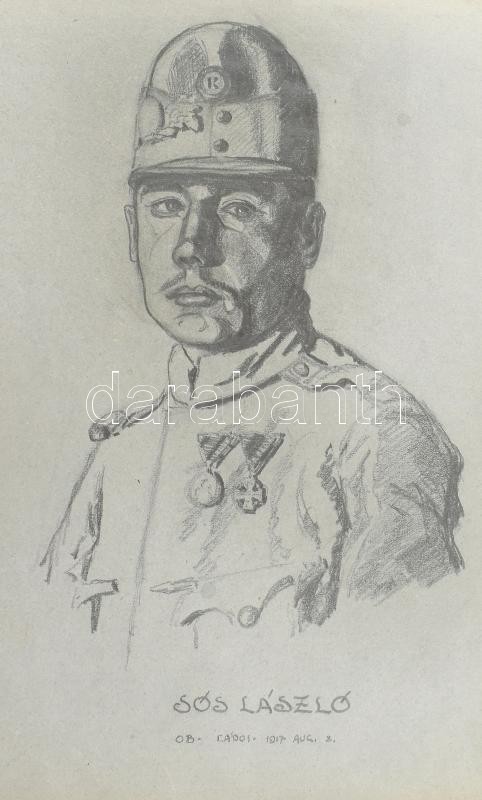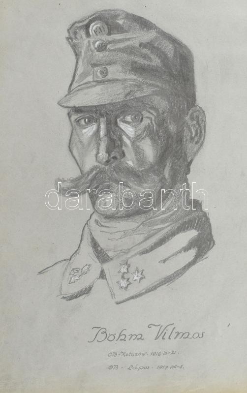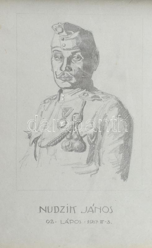 I. világháborúban részt vett katonák, népfelkelők ceruzával rajzolt korabeli portréi, mellképei, összesen 55 db. Többek közt Böhm Vilmos (1880-1949) szociáldemokrata politikus, későbbi hadügyi államtitkár (1918-1919), hadügyminiszter és hadügyi népbiztos (1919) arcképével; Bulina Gyula népfelkelő őrvezető portréjával. Több katonán kitüntetésekkel, majd mindegyiken rangjelzéssel. A katonák portréi alatt azon háborús helyszínek nevei, amelyen feltehetően részt vettek (pl. Kotuzow). A grafikus sajnos nem ismert. Korabeli kissé kopott, vászonkötésű vázlatfüzetben, a vázlatfüzet a kötéstől kissé elvált, laza. Egyes lapok jó állapotban, mindössze néhányon kisebb szakadás. Lapméret: 31x21,5 cm. Egyedi, gyűjtői ritkaság!