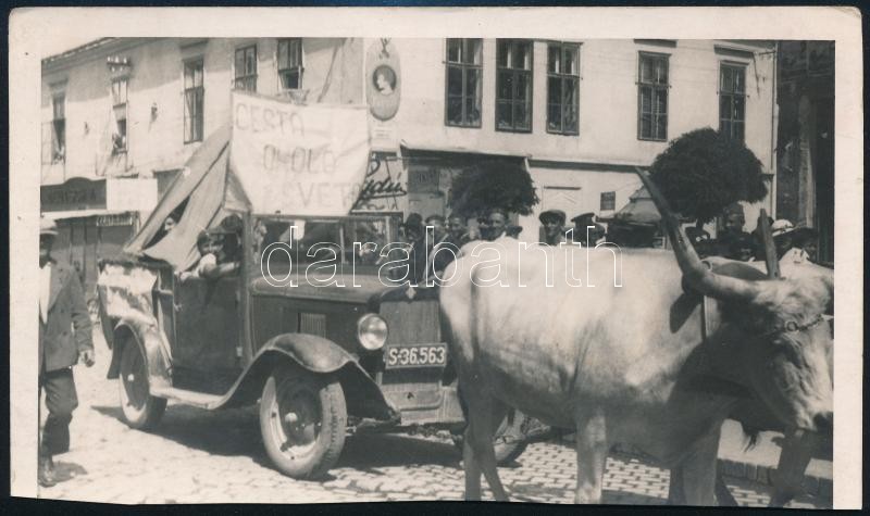 cca 1938 Léva, felvonulás a Mussolini utcán, autón szlovák nyelvű "cesta okolo sveta" (világkörüli utazás) felirattal, előtte szürkemarha, Hajdú Sándor (1905-1992) lévai fényképész felvétele, háttérben Hajdú Sándor műterme és üzlete az utca sarkán a háttérben félig takarva, vintage fotólap, 8x13,5 cm / cca 1938 Levice, parade in the Mussolini street, car with "cesta okolo sveta" sign on it, vintage photocard by photographer Sándor Hajdú (1905-1992) who was based in Levice, his studio and shop across the corner on the photo in the background, 8x13,5 cm