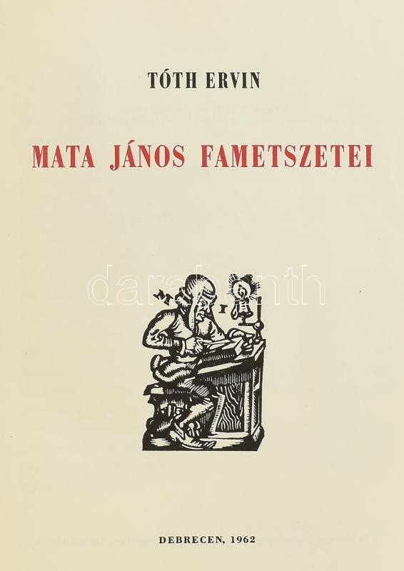 Tóth Ervin: Mata János fametszetei. Számozott példány. Mata János fametszeteivel. Debrecen, 1962, Tudományos IsmeretterjesztÅ‘ Társulat Hajdú-Bihar megyei szervezete, 25+3 p.+32 t. Kiadói félvászon-kötésben, kiadói illusztrált papÃr védÅ‘borÃtóban.