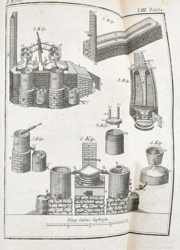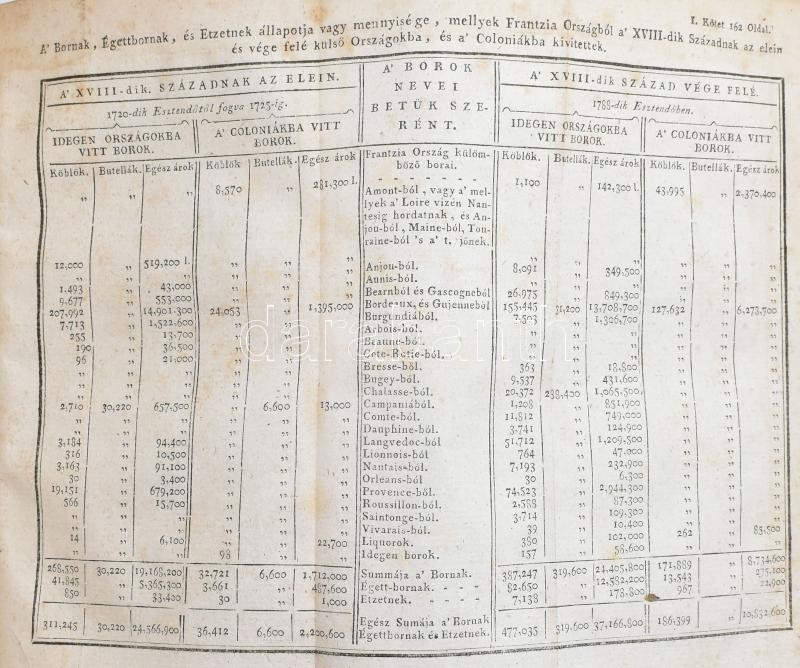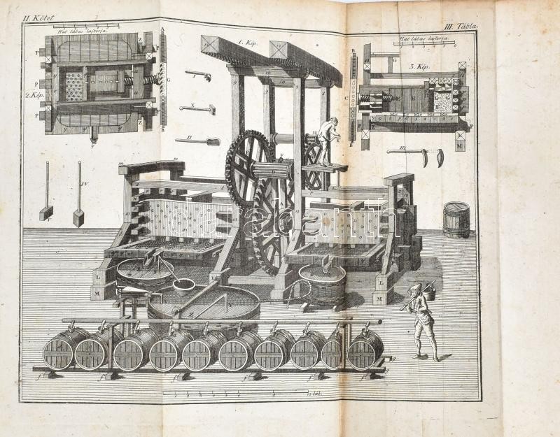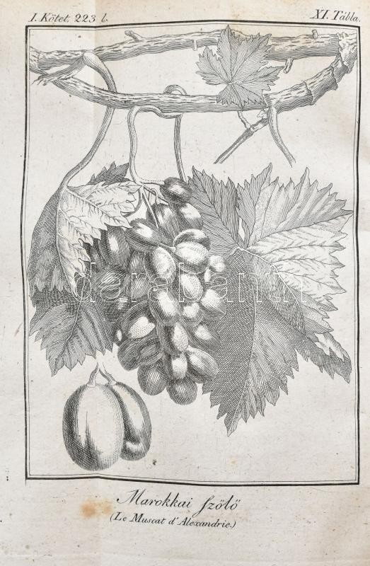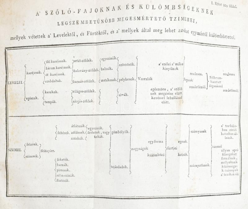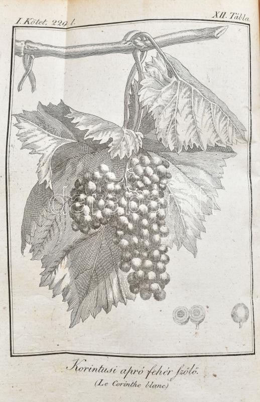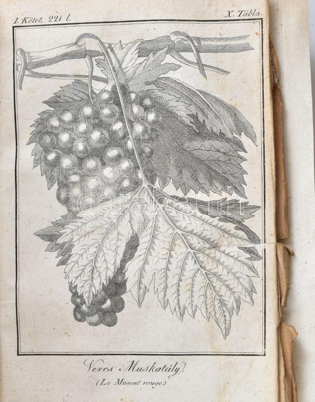 Fábián József: Visgálódó és oktató értekezés a szőlő-mívelésről. A bor, égettbor, közönséges és fűszeres etzetek készitésének mesterségével együtt. Chaptal belső minister, Rozier apátúr, Parmentier, és Dussieux polgárok által. XXI réztábla rajzolatokkal. Frantzia nyelvből fordította, és külömb-külömbféle jegyzésekkel, azok között a szőlő-czúkor, és szőlőmag-olaj tsinálásának módjával megtoldotta nemes - -. 1-2. kötet. Veszprém, 1813-1814., Számmer Klára betűivel, 15 sztl. lev.+488 p.+XII (rézmetszetű képtáblák, rajtuk szőlőfajták képeivel, Karacs Ferenc munkái.) t. +2 (kihajtható mellékletek) t.; 7 sztl. lev. +698 p.+ 14 sztl. lev.+IX (rézmetszetű képtáblák, rajtuk a bortermelés folyamatának és eszközeinek képeivel, Karacs Ferenc munkái.) t.+1 (kihajtható mellékletek) t.; Korabeli kartonált papírkötés, aranyozott gerinccel, a gerincen zöld címkével, kopott borítóval, az I. kötet gerincén és borítóján a borítás sérült, a hátsó kötéstáblák belsején a papírborítás elvált, és részben elvált, az I. kötetben foltos, a II. kötetben kissé foltos lapokkal, az I. kötetben a metszetek egy részének széle rongyos, szakadt (I-III., IV., V.,VIII., IX., X.). II. kötetben a kihajtható táblán, hajtásnyom mentén hiánnyal (3x0,5 cm.), a II. kötet egyik táblája szakadt (V.), hiányos, az első táblán ceruzás bejegyzésekkel, utolsó, kissé foltos tábla szélén a képet nem érintő hiánnyal (IX.), egy-két lap szarkán szamárfüllel, az I. kötet elején a bibliográfia 16 számozatlan levélt említ, viszont a szöveg teljes, valószínűleg az elejéről egy üres oldal hiányzik, ex libris-sekkel. Az 1802-ben kiadott korszakalkotó francia mű jelentősen átdolgozott, bővített fordítása. Megjelenése jelentős szerepet játszott a modern francia szőlőtermesztés és borászat tapasztalatainak magyarországi meghonosításában, így méltán tekinthető a magyar szakirodalom egyik legfontosabb darabjának. Rendkívül ritka!
