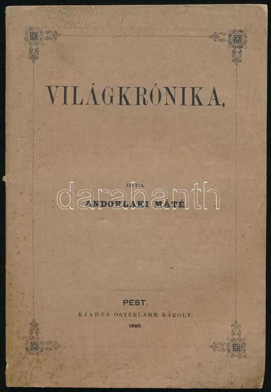 Andorlaki Máté: Világkrónika. Pest, 1860,Osterlamm Károly, XVI+148+4 p... https://www.darabanth.com/en/36-Major-auction/36.1/Books/Books-History~15116/Andorlaki-Mate-Vilagkronika-Pest-1860-Osterlamm-Karoly-XVIplus148plus4-p-Masodik-kiadas-KiadC3~II2410415