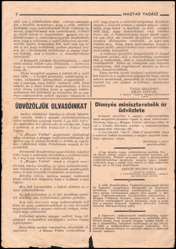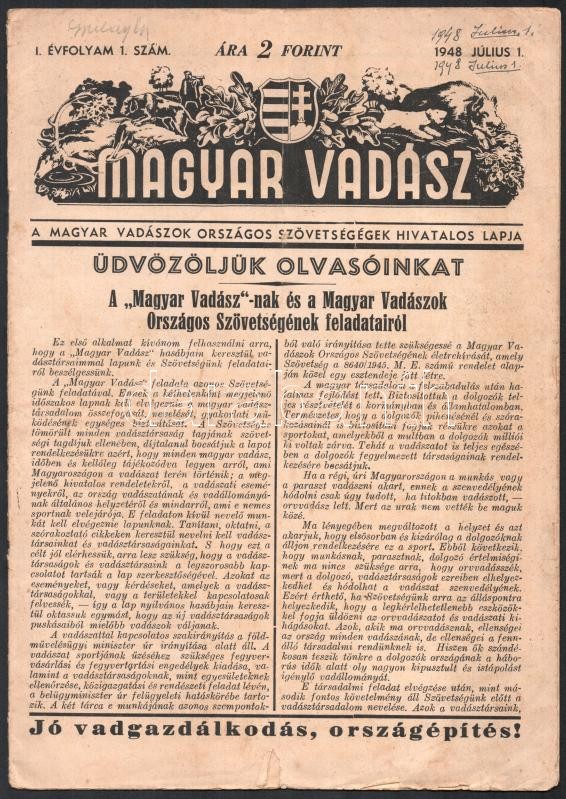 1948 Magyar Vadász. A Magyar Vadászok Országos Szövetségének hivatalos lapja, I. évf. 1. szám. 1948. júl. 1. Szerk.: Sas Árpád, Kárpáti József. Bp., Általános Nyomda, szakadásokkal, a címlapon jegyzettel, 16 p. Az új szocialista rendnek megfelelően, új vadász szövetség alakult "Magyar Vadászok Országos Szövetsége", amely a "Nimród" vadászlapból "Magyar Vadászt" csinált.