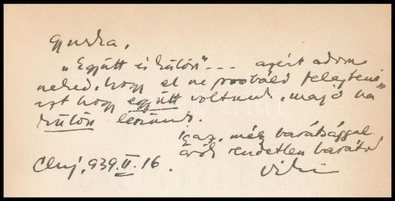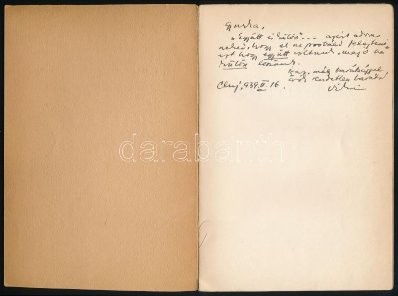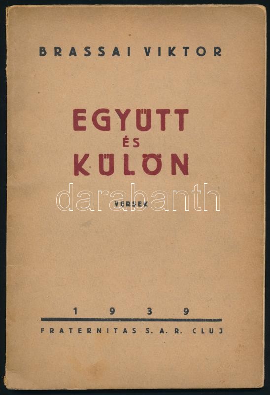 Brassai Viktor: Együtt és külön. Versek. A szerző, Brassai Viktor, (1913-1944) jogász, költő, műfordító által DEDIKÁLT példány. (1944-ben, munkaszolgálatosként halt meg.) Kolozsvár/Cluj,1939, Fraternitas S. A. R., 60+2 p. Kiadói papírkötés, kissé kopott, szakadt borítóval.