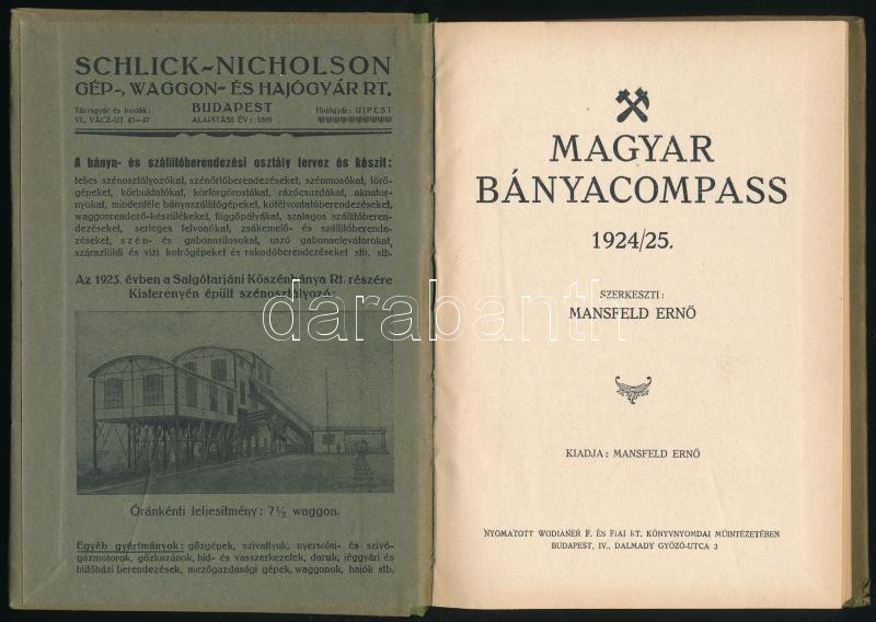 Description: Magyar bányacompass. 1924/1925. Szerk.: Mansfeld Ernő. Bp., 1924, Mansfeld Ernő, (Wodianer F. és Fiai Rt.-ny.), 84+XVI p. Korabeli reklámokkal. Hivatali tiszti és főiskolai névjegyzékkel. Kiadói kissé kopott félvászon-kötésben.