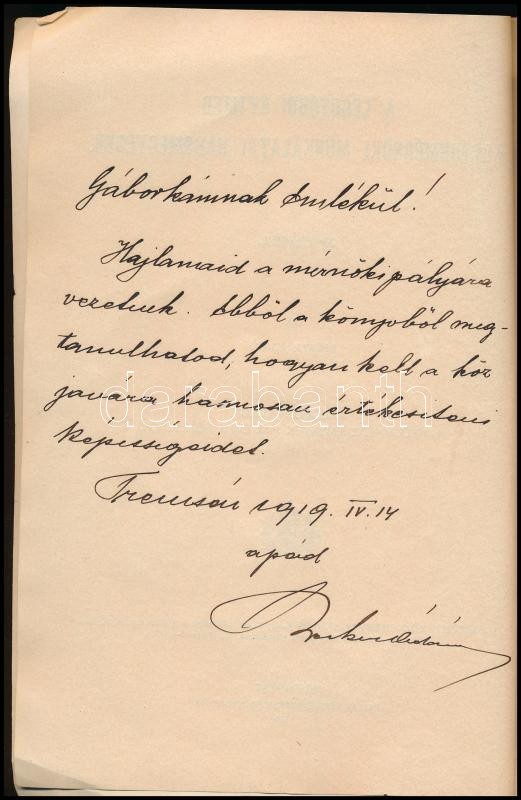 A szerző, Becker Ádám (1874-1956) mérnök fiának, Becker Gábornak szóló saját kezű dedikációjával.