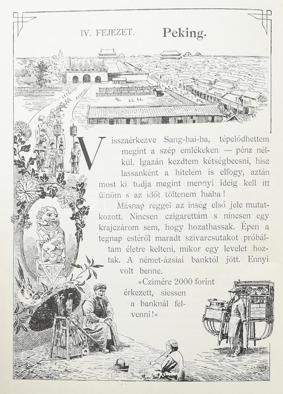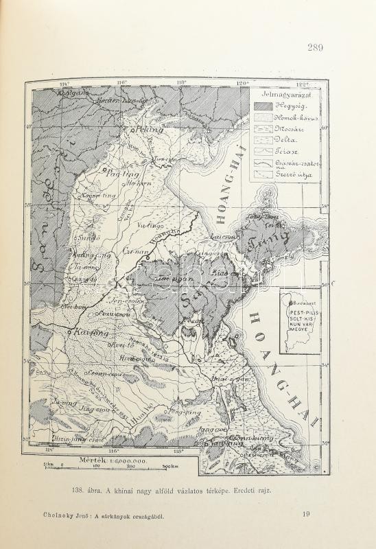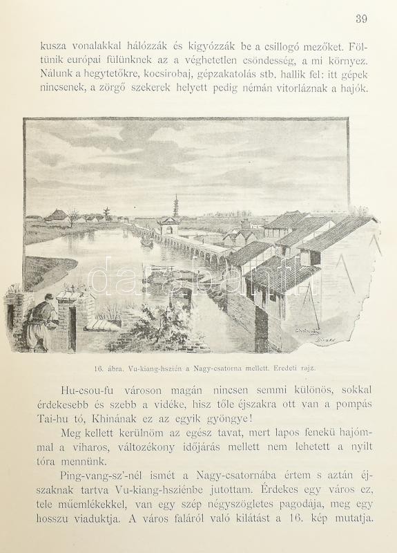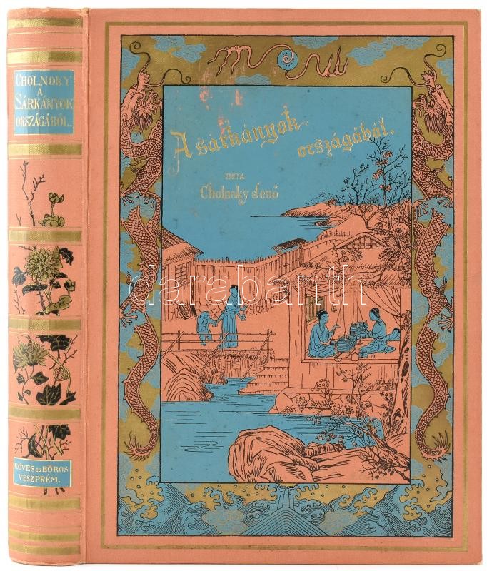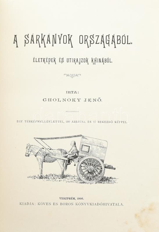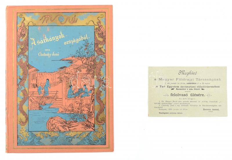 Cholnoky Jenő: A sárkányok országából. Életképek és utirajzok Khinából. Egy térképmelléklettel, 180 ábrával és 17 bekezdő képpel. Veszprém, 1900, Köves és Boros, 2+XX+365 p.+1 (kihajtható térkép) t. Első kiadás. Az oldalszámozáson belül nagyon gazdag szövegközti és egészoldalas képanyaggal illusztrált. Kiadói aranyozott, festett, illusztrált halvány téglaszínű egészvászon-kötésben, festett lapélekkel, az elülső előzéklapon névbejegyzéssel, nagyon, szép, gyűjtői állapotban. + 1899 Meghívó a Magyar Földrajzi Társaságnak f. évi január hó 26-án csütörtökön d. u. 5 órakor a Tud. Egyetem ásványtani előadó-termében tartandó felolvasó ülésre. Az ülés tárgyai: 1. Dr. Havass Rezső társ. alelnök ismerteti dr. Kőrösy Józsefnek "A felvidék eltótosodása", czímű tanulmányát. 2. Cholnoky Jenő r. tag értekezik Khinában és Mandsuországban tett útazásáról. (Később könyv formában: A sárkányok országából.), névre szóló meghívó, kis szakadással, 9,5x15 cm