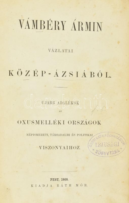 Description: Vámbéry Ármin vázlatai Közép-Ázsiából. Újabb adalékok az Oxusmelléki országok népismereti, társadalmi és politikai viszonyaihoz. Pest, 1868, Ráth Mór, V+2+385 p. Első kiadás. Korabeli kopott félbőr-kötés, régi intézményi bélyegzővel, a lapokon egészen kis foxing foltokkal.