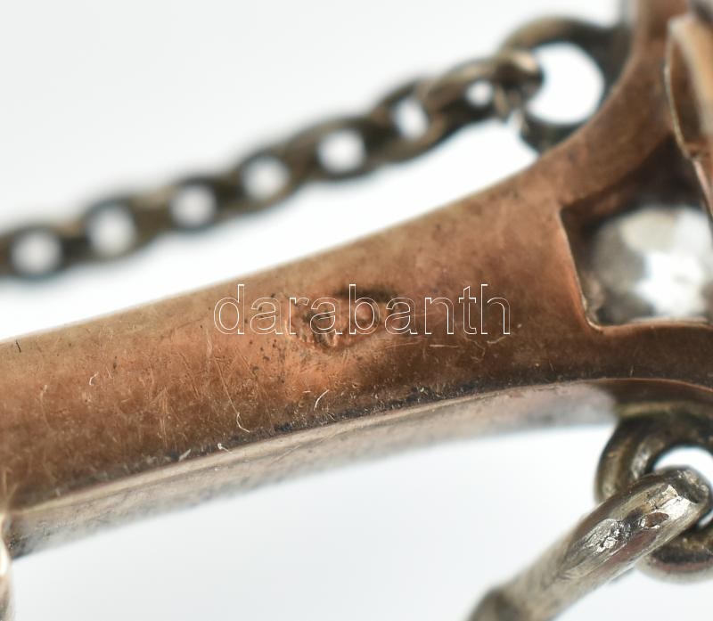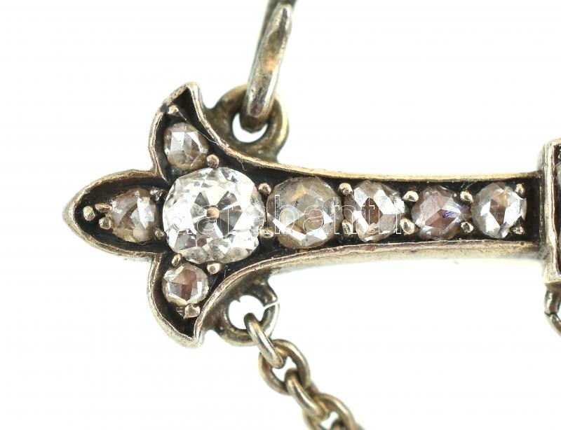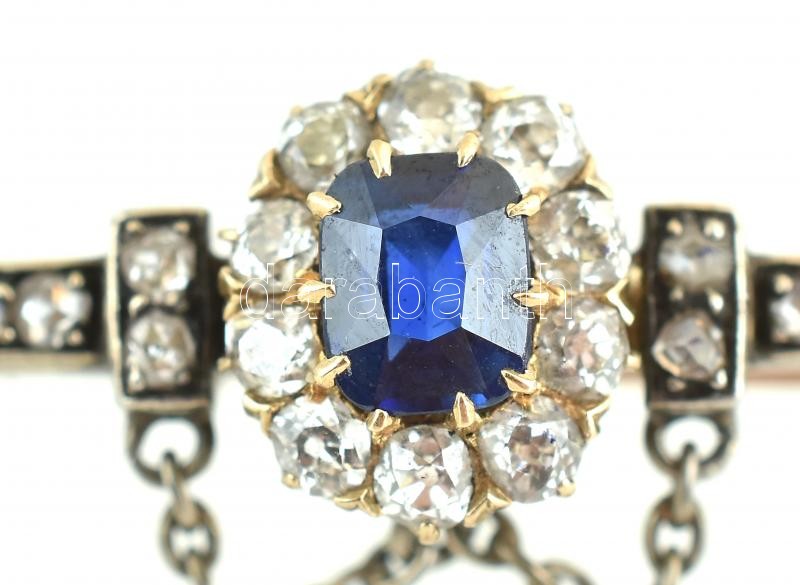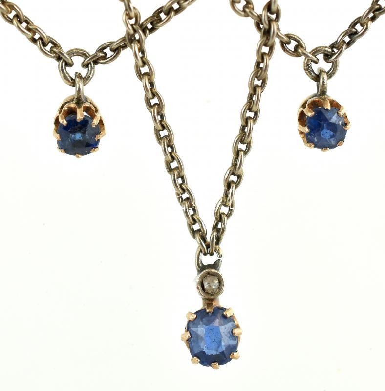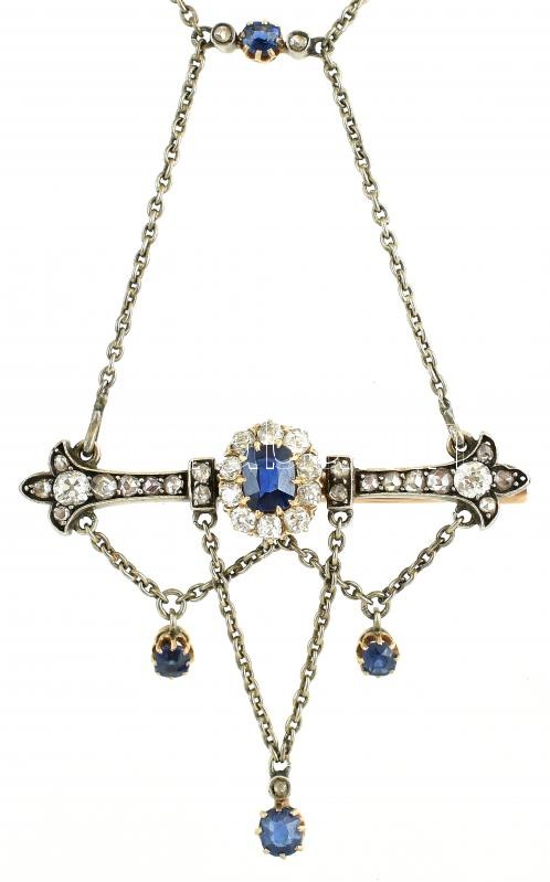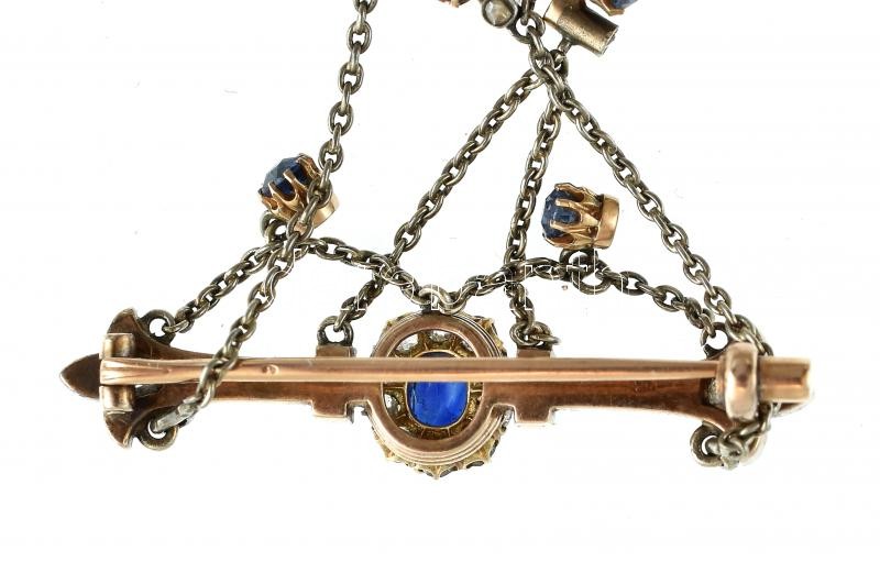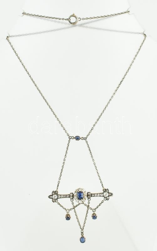 Arany (Au) 14 és 9 k. Szecessziós collier (nyakék). Brossból átalakított nyakék, 33 db apró régi csiszolású brillel (cca. 0,9 ct) és 4 db apró, 1 db nagyobb, hőkezelt zafírral ékítve. A bross 4,5cm, 14 k, jelzett, a lánc 43 cm, 9 k jelzés nélkül.