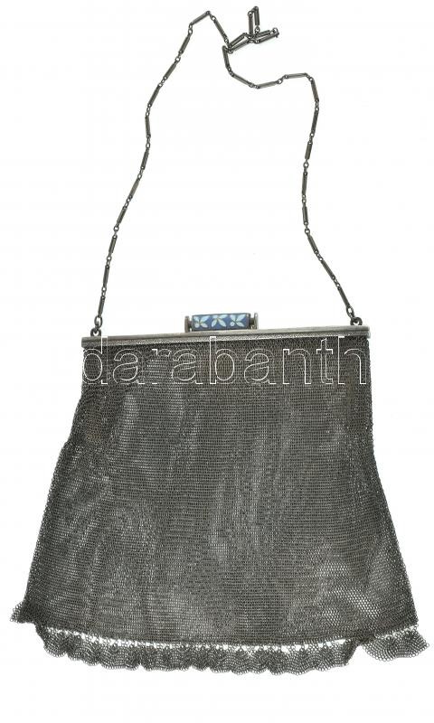 Ezüst (Ag) Színházi táska, zománc díszítéssel. Jelzett. Jó állapotú. bruttó: 129,9 g, táska mérete: 12x11 cm, lánc hossza: 37 cm