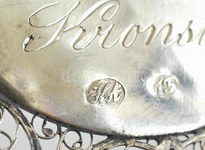 Description: Ezüst(Ag) Keresztelő medál. Keresztelő jelenettel, filigrán keretben. Jelzett: 13 lattos antik fémjel, HA mesterjeggyel, Heuffel András. 1840 körül. nettó: 28g, 10x9cm. Hátulján felirat: Karl Laczkovits geb den 8. MAY 1802. Taufpathen Franz u. Rosalia Kronstein.