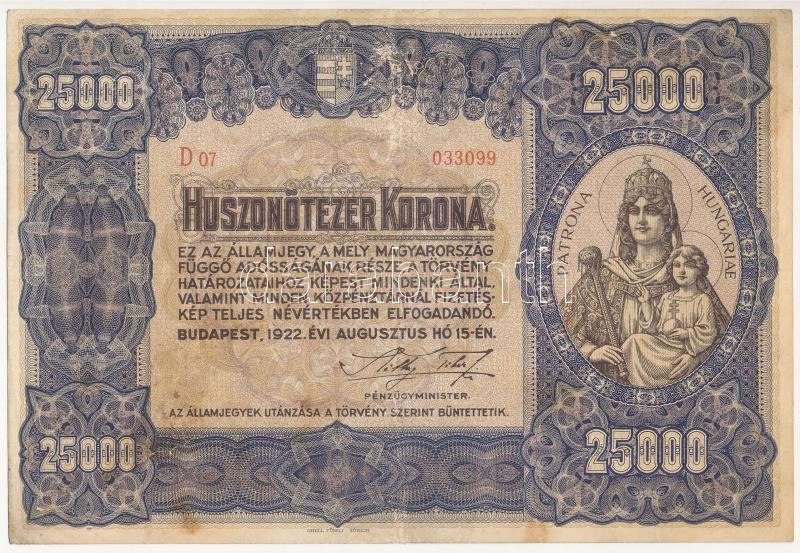 https://www.darabanth.com/en/36-Major-auction/36.1/Numismatics/Hungarian-and-foreign-banknotes~15521/1922-25000K-Orell-Fussli-Zurich-D07-033099-TIII-helyenkent-kopott-papir-kis-szakadas-f~II2488250