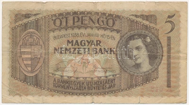 1938. 5P "K048 016994" T:III- hajtásoknál helyenként elvékon... https://www.darabanth.com/en/36-Major-auction/36.1/Numismatics/Hungarian-and-foreign-banknotes~15521/1938-5P-K048-016994-TIII-hajtasoknal-helyenkent-elvekonyodott-papir-RR-Hungary-1938-5-~II2488473