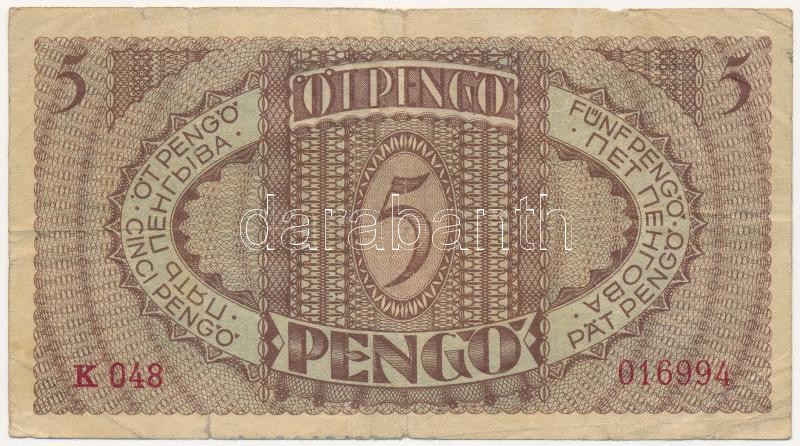 Description: 1938. 5P "K048 016994" T:III- hajtásoknál helyenként elvékonyodott papír RR! / Hungary 1938. 5 Pengő "K048 016994" with C:VG paper thinned in places at the folds VERY RARE! Adamo P5