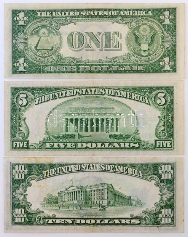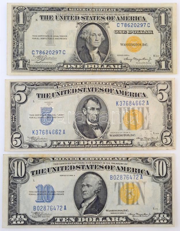 Amerikai Egyesült Államok 1935-1945. (1935A) 1$ "Silver certificate" sárga pecséttel "William Alexander Julian, Henry Morgenthau" + 1934-1945. (1934A) 5$ "Silver certificate" sárga pecséttel "William Alexander Julian, Henry Morgenthau" + 1934-1945. (1934A) 10$ "Silver certificate" sárga pecséttel "William Alexander Julian, Henry Morgenthau" (fo.) T:III / USA 1935-1945. (1935A) 1 Dollar "Silver certificate" with yellow seal "William Alexander Julian, Henry Morgenthau" + 1934-1945. (1934A) 5 Dollars "Silver certificate" with yellow seal "William Alexander Julian, Henry Morgenthau" + 1934-1945. (1934A) 10 Dollars "Silver certificate" with yellow seal "William Alexander Julian, Henry Morgenthau" (spotted) C:F