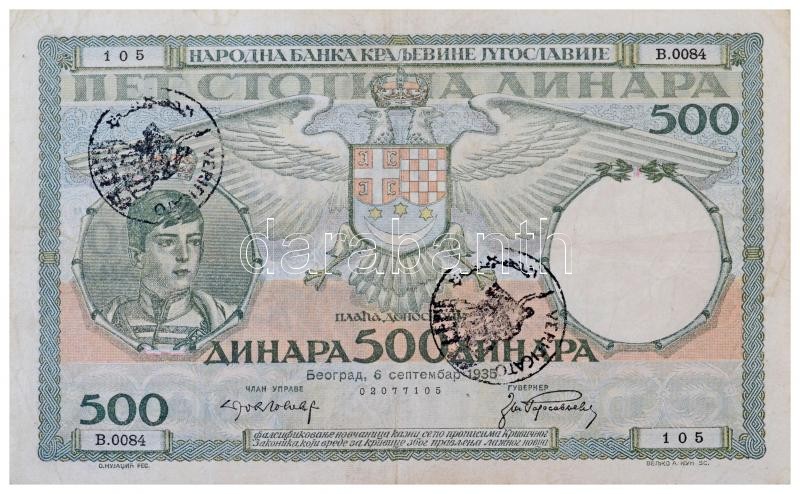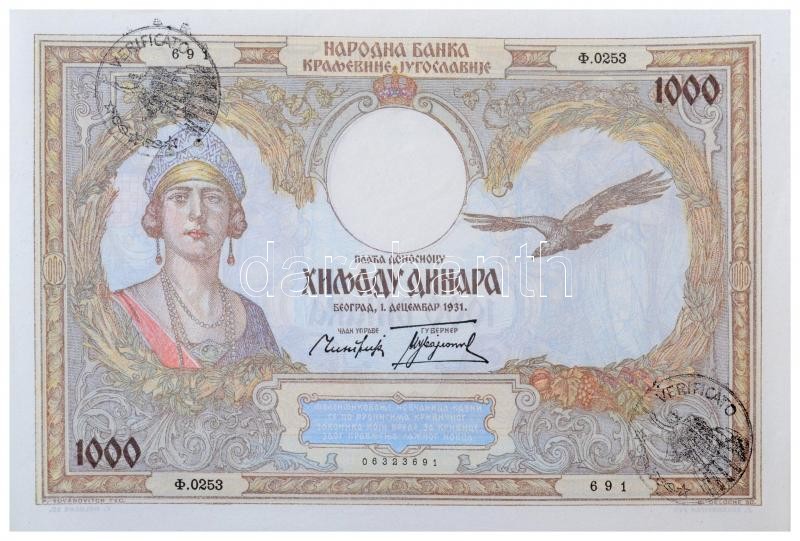 Jugoszlávia 1920-1929. 100D (5x), ebből 4x Karageorge, 1x I. Sándor vízjellel, közte egy hamis felülbélyegzés + 1931. 50D + 1931. 1000D + 1935. 500D + 1936. 20D nyomdahibás, halovány nyomat + 1939. 10D, mind olasz "VERIFICATO" felülbélyegzéssel T:I--III- / Yugoslavia 1920-1929. 100D (5x), 4x with Karageorge, 1x with Alexander I watermark, with one counterfait overprint + 1931. 50 Dinara + 1931. 1000 Dinara + 1935. 500 Dinara + 1936. 20 Dinara with faint print printing error + 1939. 10 Dinara, all with Italian "VERIFICATO" overprint C:AU-VG Krause P# 22, 27a, b, 28, 29, 30, 32, 35