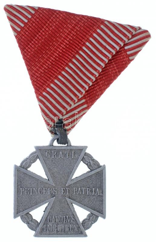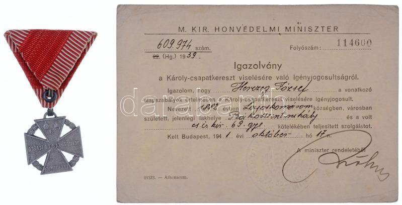 1916. "Károly-csapatkereszt" Al(!) kitüntetés mellszalagon + 1939. "Károly-csapatkereszt" viselésére jogosító igazolvány, "Magyar Királyi Honvédelmi Miniszter" szárazpecséttel T:2 / Hungary 1916. "Charles Troop Cross" Al(!) decoration on ribbon + 1939. Charles Troop Cross" bearers ID with "Magyar Királyi Honvédelmi Miniszter" embossed stamp C:XF