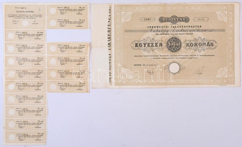 Arad 1912. "Aradmegyei Takarékpénztár" névre szóló részvénye 1000K értékben, szelvényekkel és szárazpecséttel T:III / Hungary / Arad 1912. "Aradmegyei Takarékpénztár (Arad County Savings Bank)" saving bank's share with shareholder's name about 1000 Korona, with coupons and embossed stamp C:F