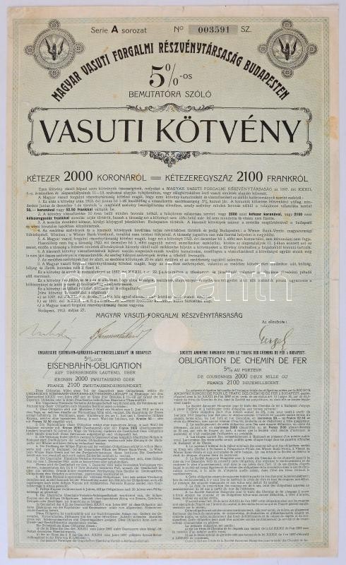 Budapest 1913. "Magyar Vasúti Forgalmi Részvénytársaság" 5%-os vasúti kötvénye, magyar, német és francia nyelven T:III / Hungary / Budapest 1913. "Magyar Vasúti Forgalmi Részvénytársaság" 5% interest railway bond in hungarian, german and french language C:F