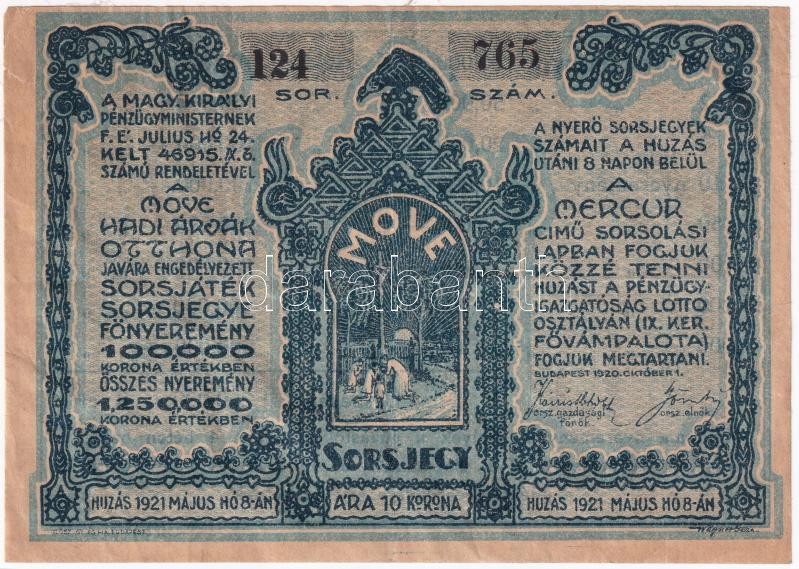 Budapest 1920. "A MOVE Hadi Árvák Otthona javára rendezett sorsjá... https://www.darabanth.com/en/36-Major-auction/36.1/Numismatics/Shares-Securities-and-Tickets~15171/Budapest-1920-A-MOVE-Hadi-Arvak-Otthona-javara-rendezett-sorsjatek-sorsjegye-10K-ertekben-~II2491464
